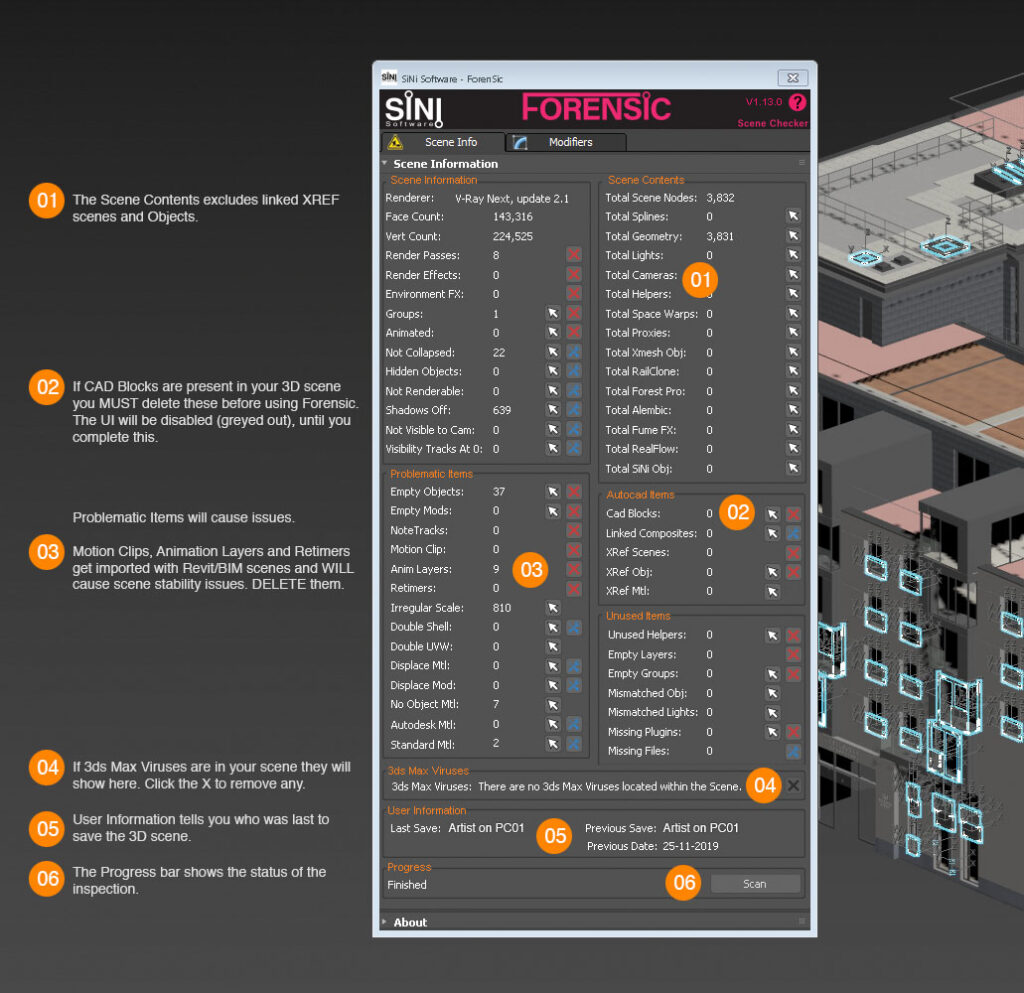 Đây là một công cụ phân tích cảnh, giúp phát hiện và sửa lỗi trong các dự án lớn. Forensic có khả năng tìm ra các vấn đề như vật liệu bị thiếu, đối tượng trùng lặp hoặc lỗi kết cấu, từ đó đảm bảo dự án luôn ở trạng thái tốt nhất trước khi render.